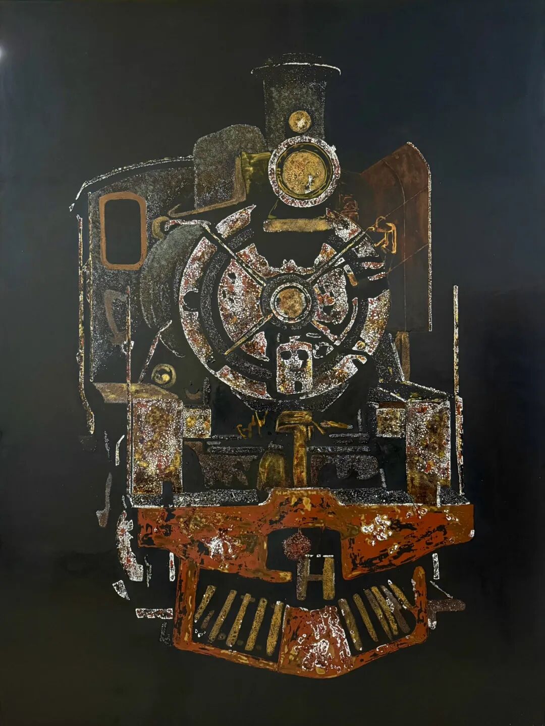 Among numerous entries, the lacquer painting Forward stood out for its distinctive artistic language and profound spiritual depth, earning a place on the stage of this national cultural and artistic event. Centered on the image of a steam locomotive, the work adopts a visually striking, strictly frontal perspective to transform this emblematic symbol of industrial civilization into a towering “monument of steel.” In its creative approach, the artist abandons complex coloration and instead uses the deep, mysterious black unique to lacquer as the tonal foundation. Through repeated coating, meticulous polishing, and other traditional techniques, the lacquer layers achieve a warm yet weighty texture. The brushwork reveals both the austere, angular structure of steel and the subtle shimmer inherent to lacquer, infusing the cold mechanical imagery with a sense of human warmth.